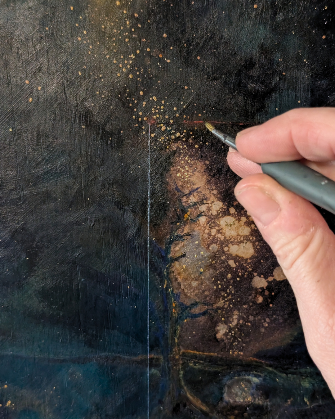 Her process is intricate, intuitive, and deeply layered: drawing, painting, gilding, scraping, piercing, printing, and piecing together fragments. Each work grows organically as she watches her materials move, react, and surprise her. Hannah describes her paintings as “spaces and places to fill with stories and maybes”, speculative environments that reference earthly horizons, skies, and oceans, yet are invoked from memory, sensation, and imagined terrain. They are ellipses in visual form: unfinished thoughts, narrative omissions, the spaces between.