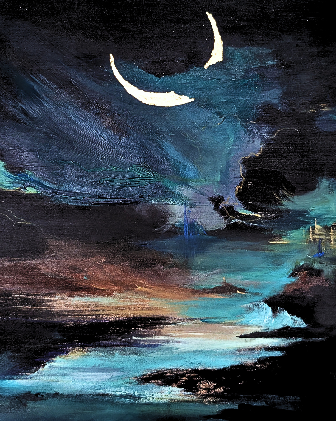 Her work is shaped by a fascination with awe and the unknown. As writer Katherine May observes, “Feeling awe cracks us open. It is a vulnerable experience; it softens us in a time when it’s so easy to harden.” Hannah’s paintings lean into that softness, the quiet, expansive feeling of standing before something larger than yourself. They shift physically and emotionally each time they’re viewed, reflecting and absorbing light and dark, inviting the viewer to linger, interpret, and find their own resonance within the work.