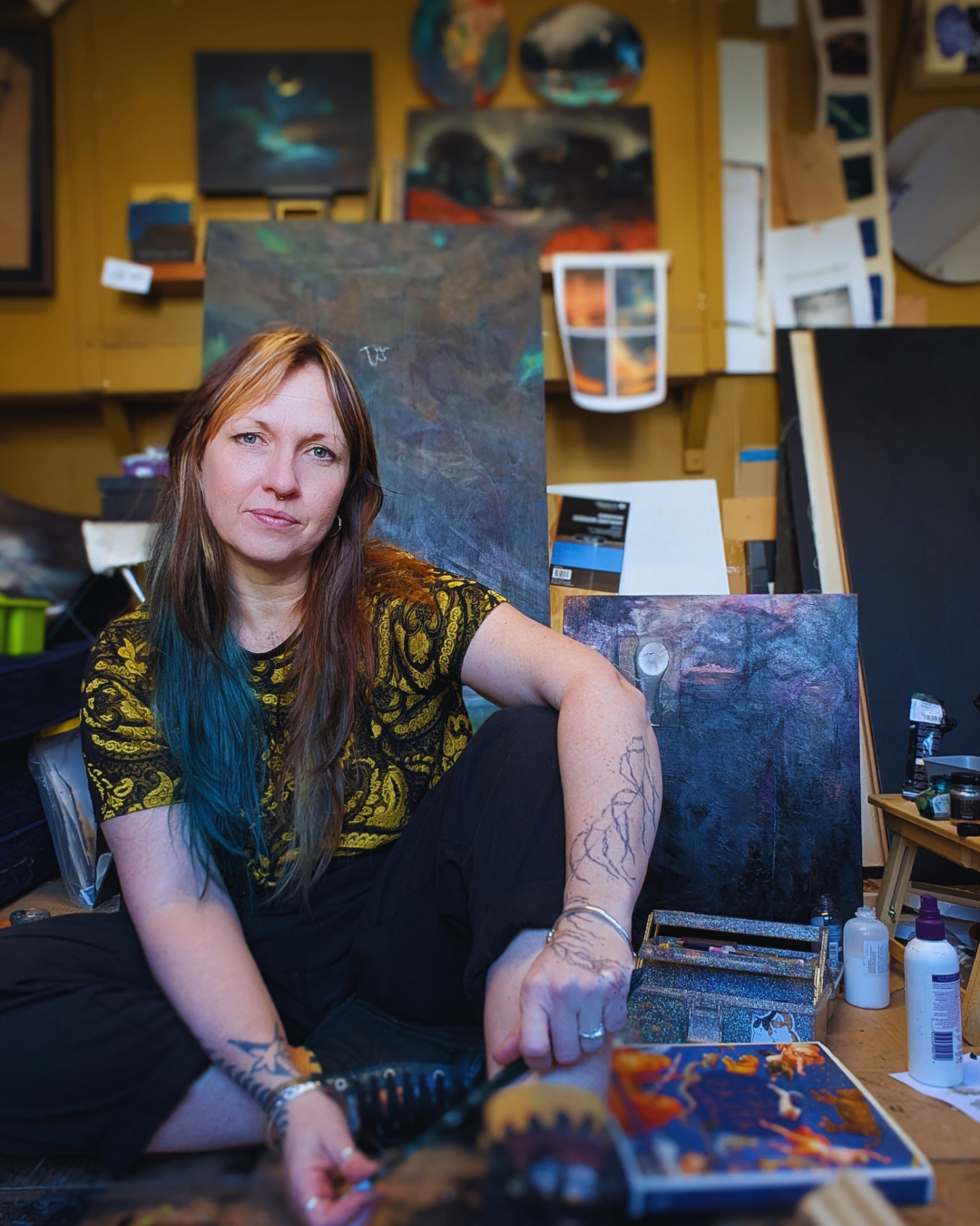 Hannah Pugh is a Worcestershire‑based contemporary painter whose work explores liminality, celestial patterning, and the quiet, potent spaces that exist between memory and imagination. Working with ink, bleach, watercolour, and precious metal leaf on raw canvas and heavy papers, she creates atmospheric compositions that hover between landscape and dreamscape, portals into a personal Elsewhere.