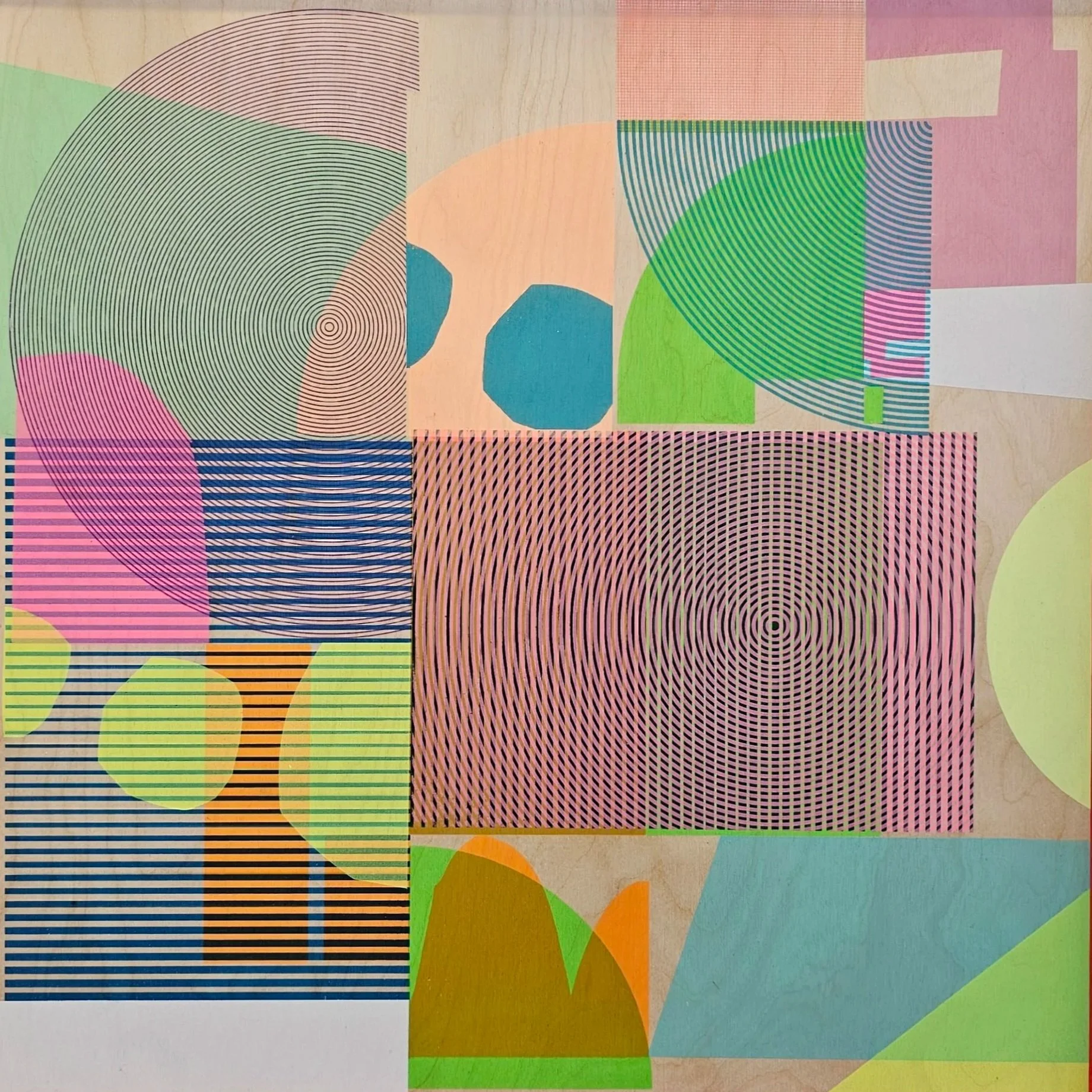 Iain's work borrows language from other art forms, film and photography, poetry, electronic music and rave culture. Layers of fragmented iconography and geometry coalesce, like motes of dust trapped in a beam of light teasing us with a cheeky glimpse of a much bigger gestalt.