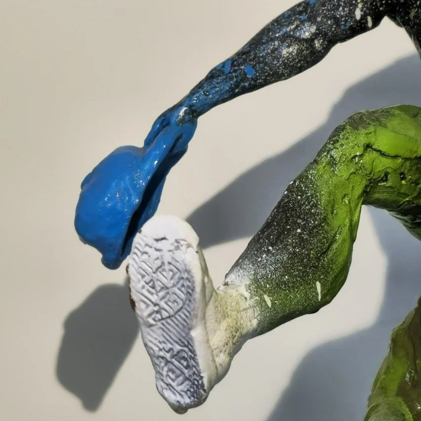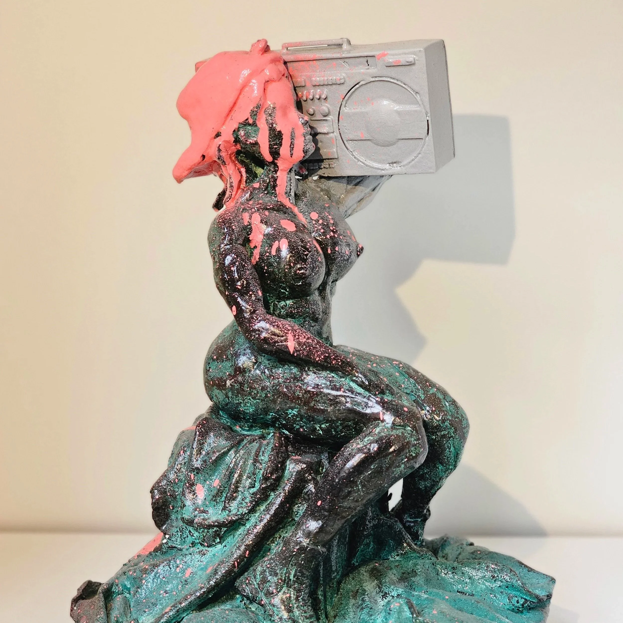 Craig Hudson’s sculpture plays with confusion and contradiction. He subverts the expectations of bronze, a medium that has been used to depict classical characters from Greek and Roman mythology, with their perfect and immortal forms. His figures are human and flawed, with a mix of naivety and vulnerability, strength and capability. Hudson’s work, like the artist, is quiet and yet cool, immersed in popular culture references that are instantly engaging.