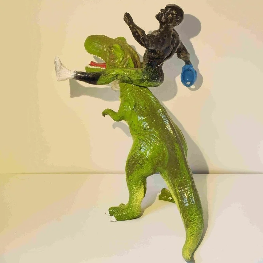 Craig Hudson throws tradition out the saloon doors with Tyrannosaurus Express, one’s cinematic mischief in molten metal. Think Spielberg meets spaghetti Western with a touch of bronze bravado. Forget horses. This cowboy rides a roaring, lime green Tyrannosaurus rex, jaws wide, tongue flashing red as if charging into a blockbuster showdown.